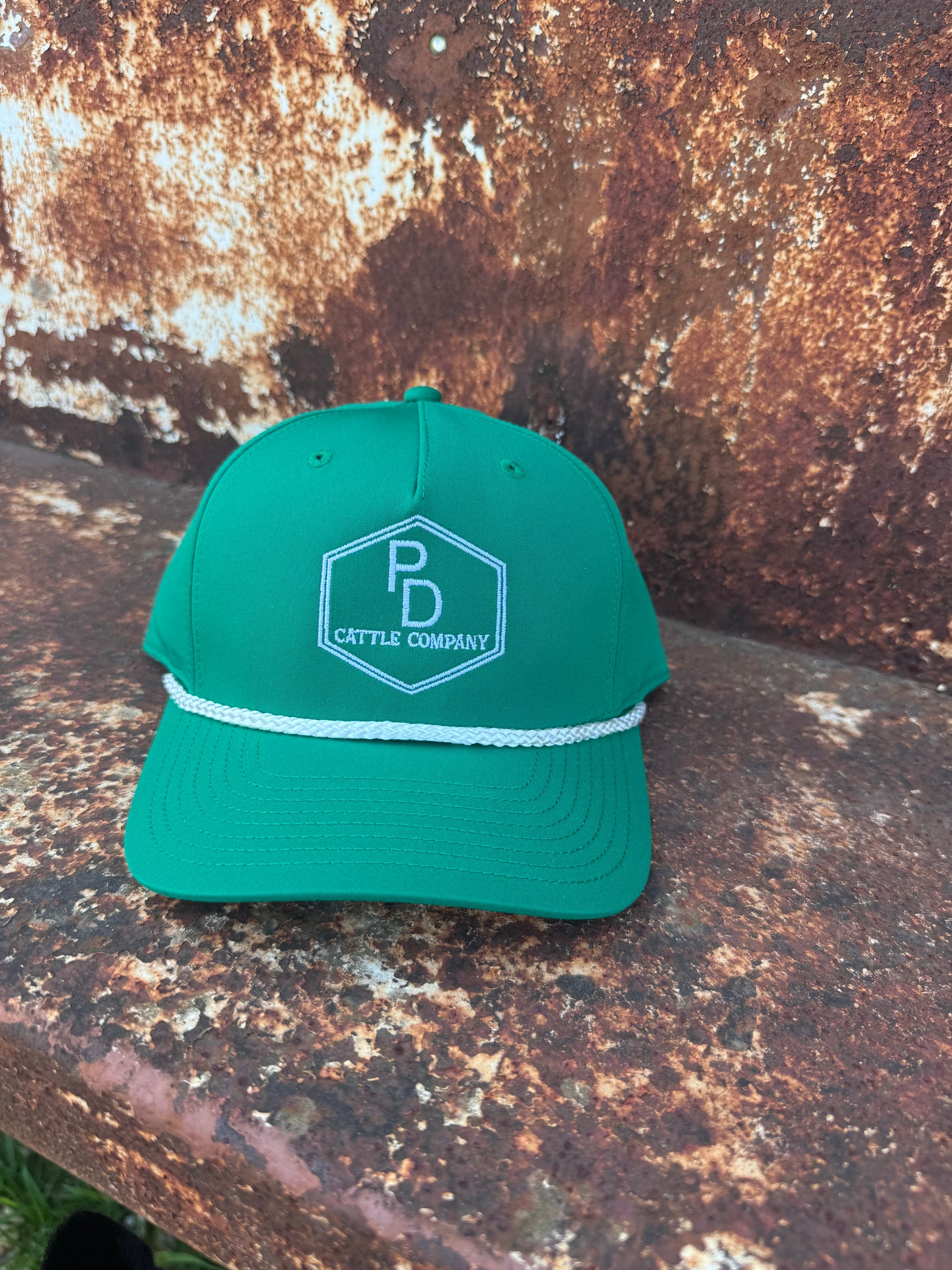 Embroidered PD Cattle logo on a John Deere green rope cap!